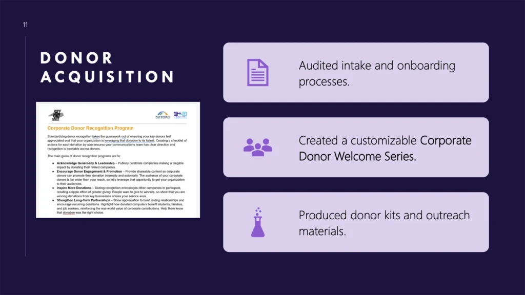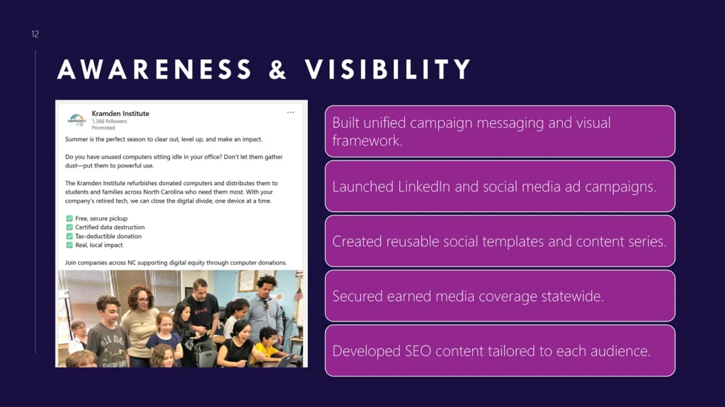 The Close the Digital Divide project proves that a communications strategy is one of the most powerful tools nonprofits can invest in. What started as a drive for computer donations evolved into a sustainable movement to expand opportunity across North Carolina. With the right stories, strategy, and systems in place, Kramden and E2D not only reached new audiences but also achieved significant growth. They redefined what impact looks like in their communities.