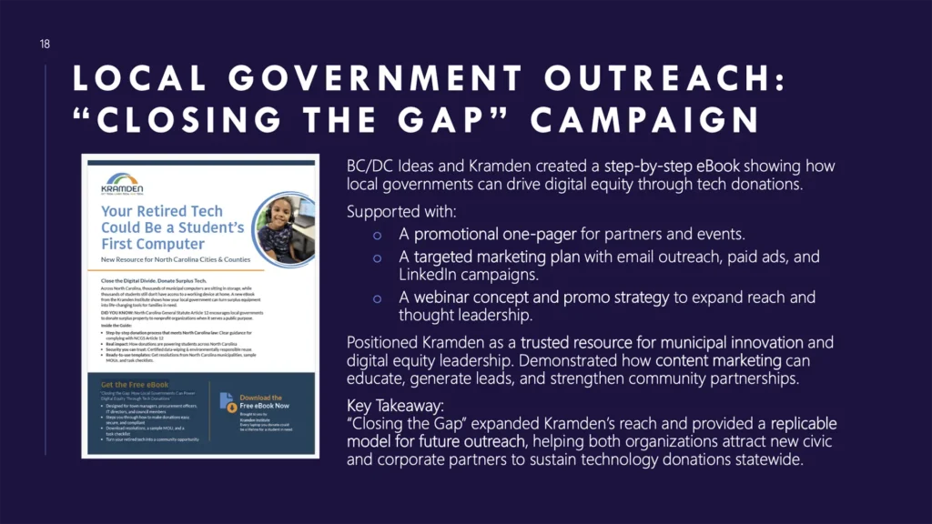 - Campaign Development – The team crafted compelling images for social ads. We collaborated with the Kramden Institute to create the “Closing the Gap: How Local Governments Can Power Digital Access Through Tech Donations” eBook and one-pager to inspire action and attract new audiences.